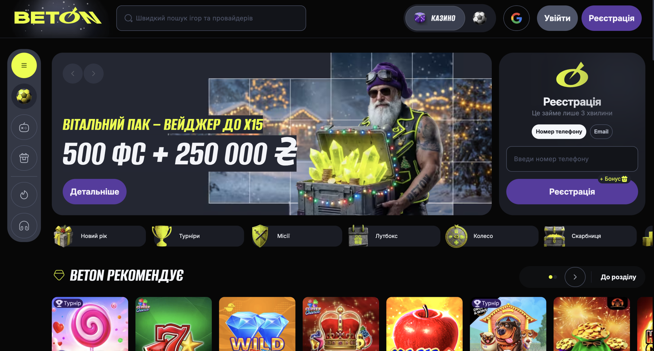 Казино онлайн BetOn відповідає всім критеріям, за якими гравці та експерти оцінюють якісний азартний сайт. На ньому ти знайдеш гідний сервіс, широкий вибір найкращих ігор різних жанрів та щедрі бонуси. Відразу після реєстрації можна грати в казино на гроші, при цьому ти отримаєш вітальний пакет, що містить до 500 безкоштовних обертань і 250 000 гривень. При подальшій грі в казино на реальні гроші на тебе також чекатимуть бонуси. Інші плюси казино BetOn: